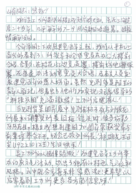發布時間: 2021-08-20 點擊數量:5465“以人性化服務和溫情服務為宗旨,努力做到讓老同志方便、放心、滿意,感受到家人般的溫暖”,這是離退休辦公室的服務宗旨。近日,一封感謝信從遠在上海定居的老同志寄來,信里表達了對工力所在建黨百年之際取得的成績感到驕傲和自豪,重點感謝了離退辦同志對異地居住和就醫的老同志給予生活上和就醫方面的關心和幫助。他飽含感激之情地講述了幾件事,他說“我們講述幾件個人小事,但能說明工力所不單培養科技人才,為民辦事一般工作人員也是稱職的。”“全心全意為人民服務的精神傳遞了黨和政府對老年人的關愛”……老同志口中的小事都是我們為群眾服務的大事,我們要為群眾辦真事、真辦事。