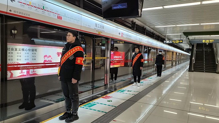 青年志愿者來到哈爾濱地鐵“理工大學(xué)站”開展了志愿服務(wù),他們身著禮儀綬帶、紅色袖標(biāo)站在地鐵站的出入口、售票機(jī)、閘機(jī)口、上下站等位置,為乘客提供指引、咨詢、購(gòu)票等一系列乘車服務(wù),并開展了站內(nèi)地面、墻面清潔工作。