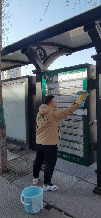 志愿者走上街頭清洗公交站牌、清掃研究生生活區(qū)