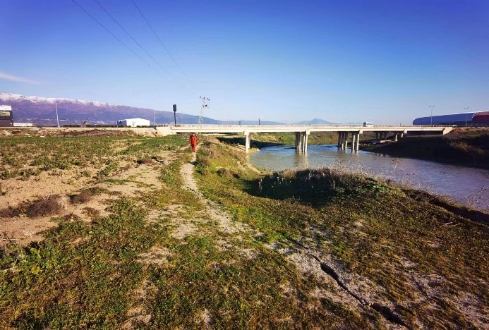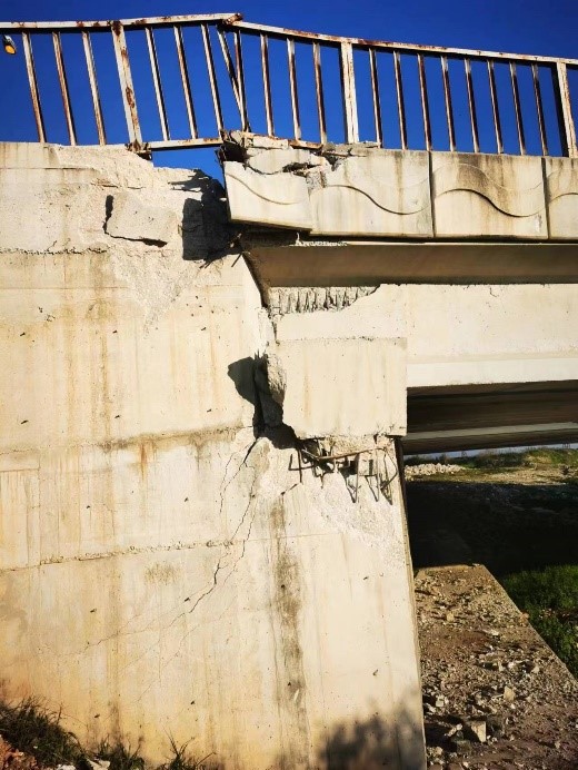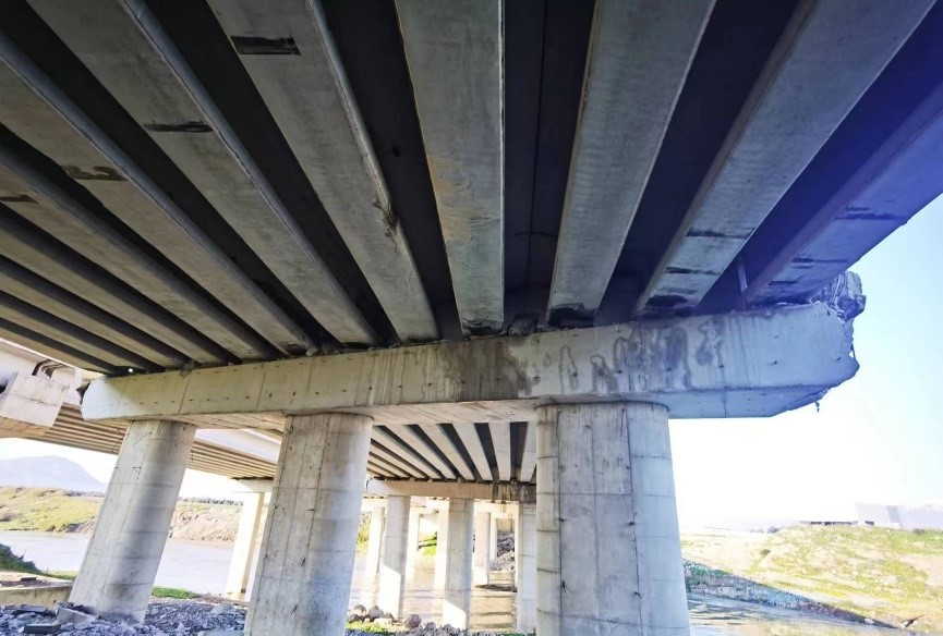 2月15日,對營地附近的一座橋梁進行了觀察(圖1)。該橋梁為一座雙向五跨雙墩簡支梁橋。地震發(fā)生時河岸兩地劇烈晃動,兩岸場地帶動橋臺相向運動,橋梁受擠壓整體向上抬起。