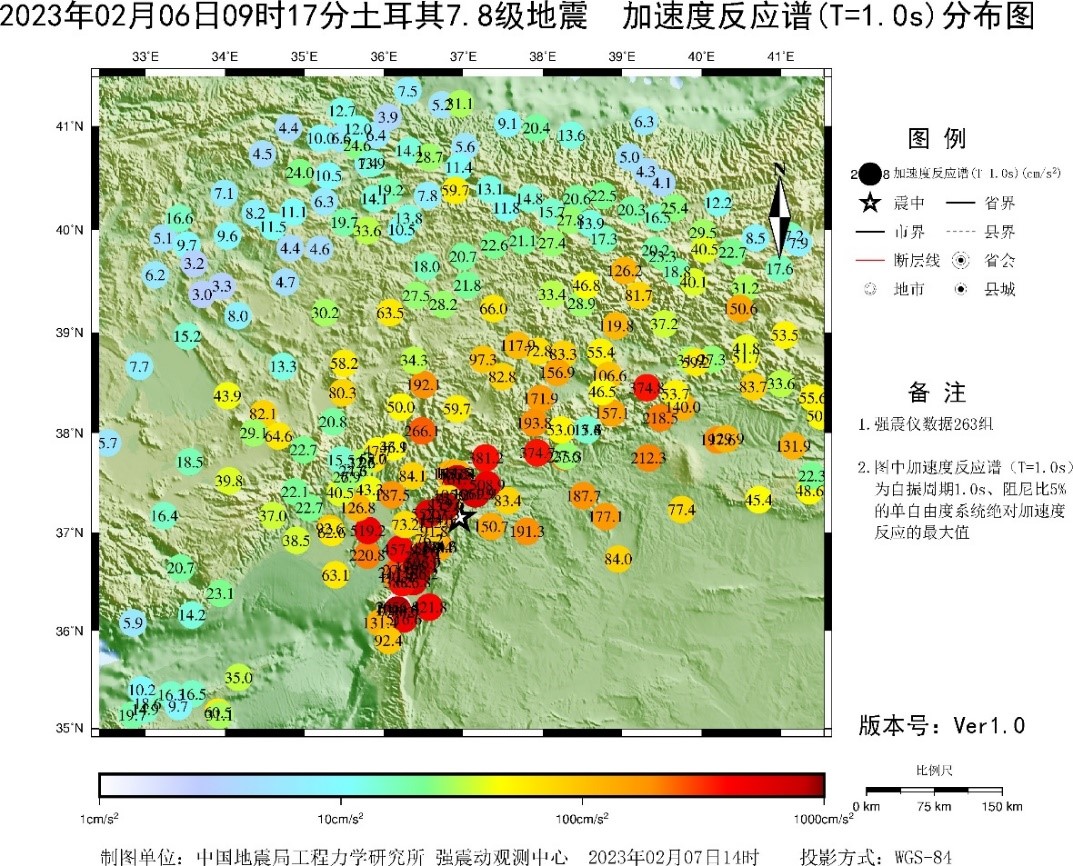 圖5 土耳其7.8級地震加速度反應(yīng)譜(T=1.0s)分布圖
