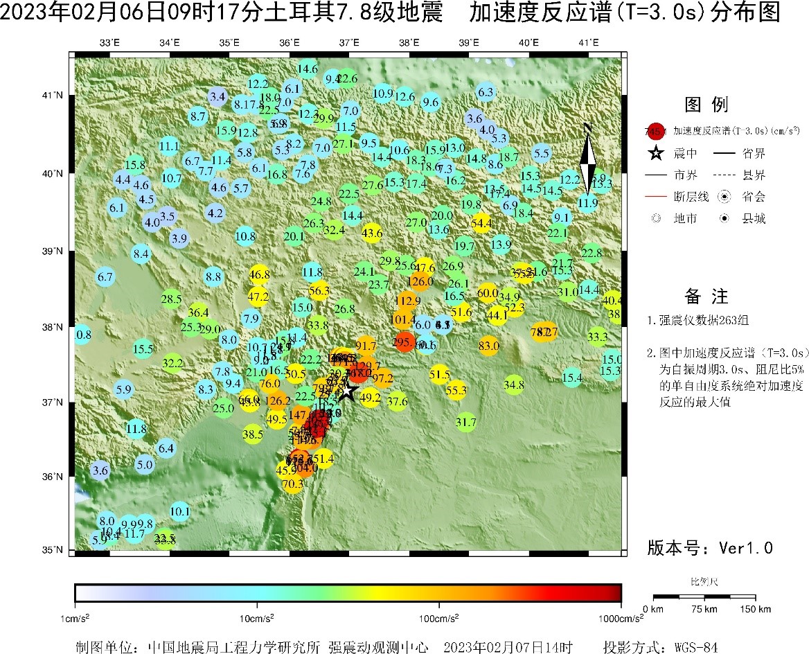 圖6 土耳其7.8級地震加速度反應(yīng)譜(T=3.0s)分布圖