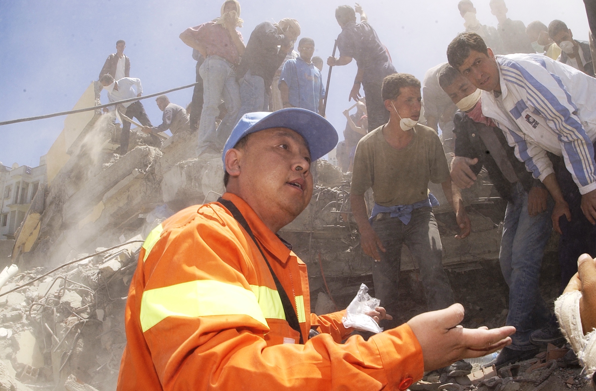 發布時間: 2023-08-02 點擊數量:7659走進位于哈爾濱市南崗區的中國地震局工程力學研究所(簡稱“工力所”),文化墻上的一幅照片格外引人注目:震后的斷壁殘垣間,深膚色卷頭發的救援人員圍住一位中國專家,他身穿橘黃色國際救援隊服,正全神貫注地講解著。這是工力所二級研究員、博士生導師孫柏濤,作為中國國際救援隊專家參與指導2003年阿爾及利亞地震現場救援的場景。