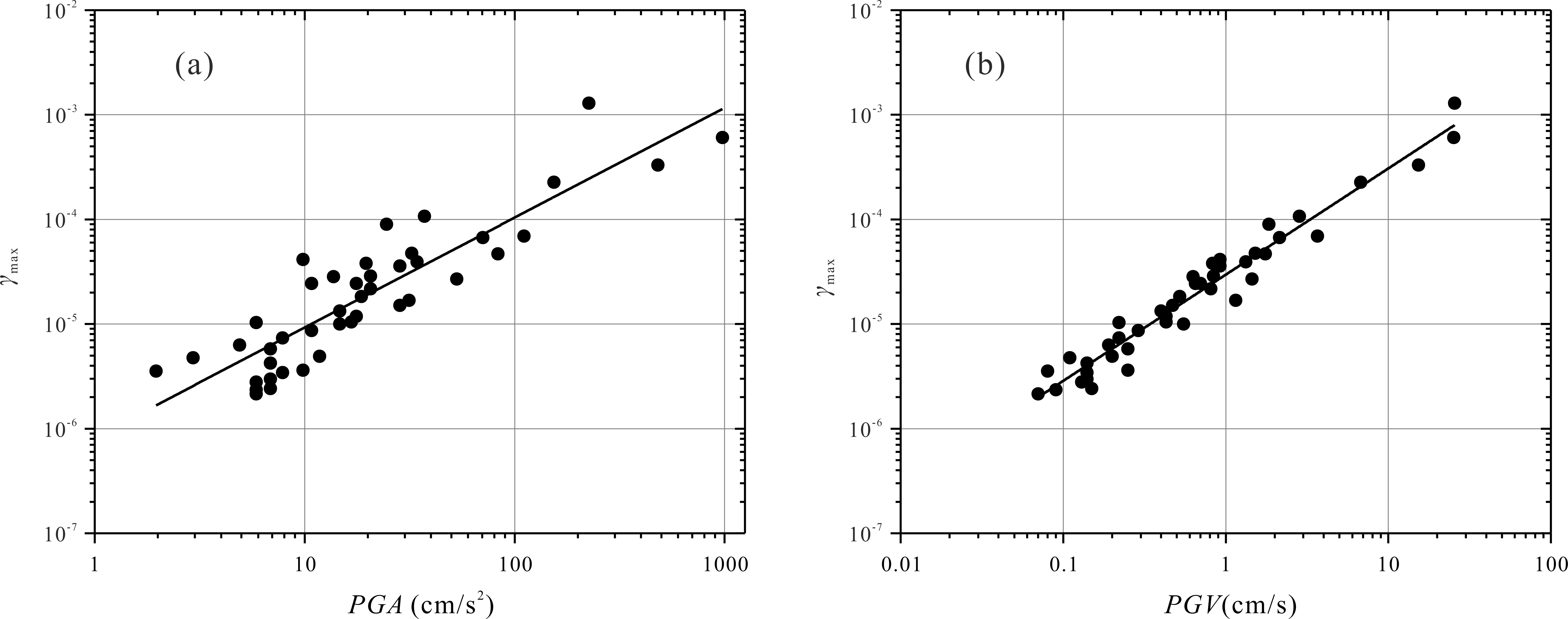 圖2. 近地表上部土體的最大原位剪切應變(γmax)分別與PGA、PGV的關系。(a)γmax與PGA的關系;(b)γmax與PGV的關系。