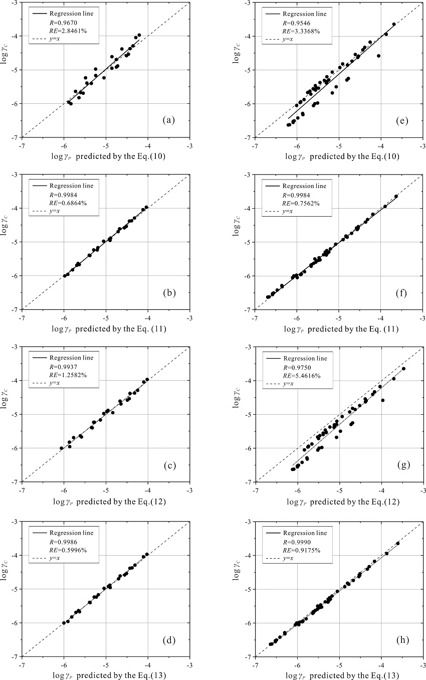 圖3.剪切應變剖面模型的驗證結果。左欄為Eureka臺陣(巖土剖面中均為土)數據的驗證結果,右欄為Corona臺陣(巖土剖面中22米之上為土,之下為基巖)數據的驗證結果。