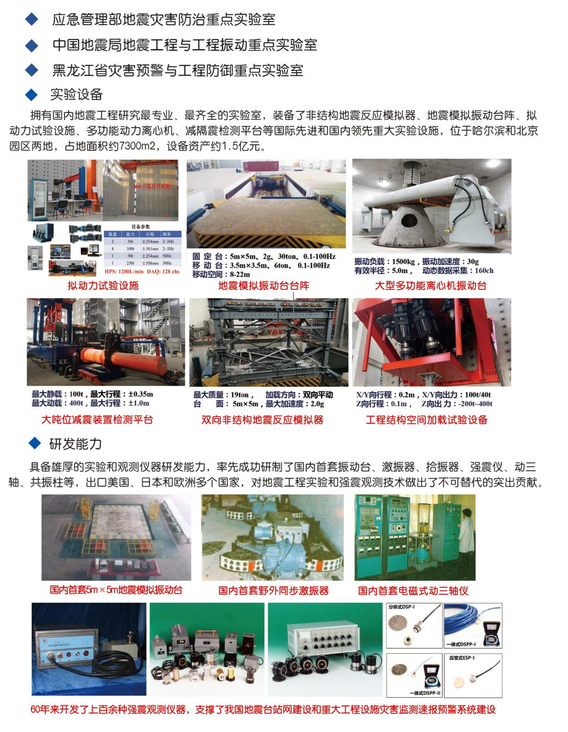研究所科技隊伍實力雄厚,現有院士5人(含兼職3人)、正研級專家34人(含二級崗研究員9人)、高級職稱專家100余人。現有中國地震局科技創新團隊8個、黑龍江省“頭雁”團隊1個。主攻研究方向包括:強震動觀測及其應用、工程地震學、建筑工程抗震、生命線地震工程、巖土地震工程、地震災害風險區劃與防治、地震工程試驗技術、地震與工程振動測量技術等。在北京東燕郊設有科技園區,建有應急管理部地震災害防治重點實驗室、中國地震局地震工程與工程振動重點實驗室、黑龍江省災害預警與工程防御重點實驗室、黑龍江省防震減災工程技術研究中心,擁有國際先進、國內領先的地震工程綜合試驗系統。